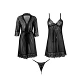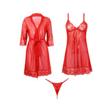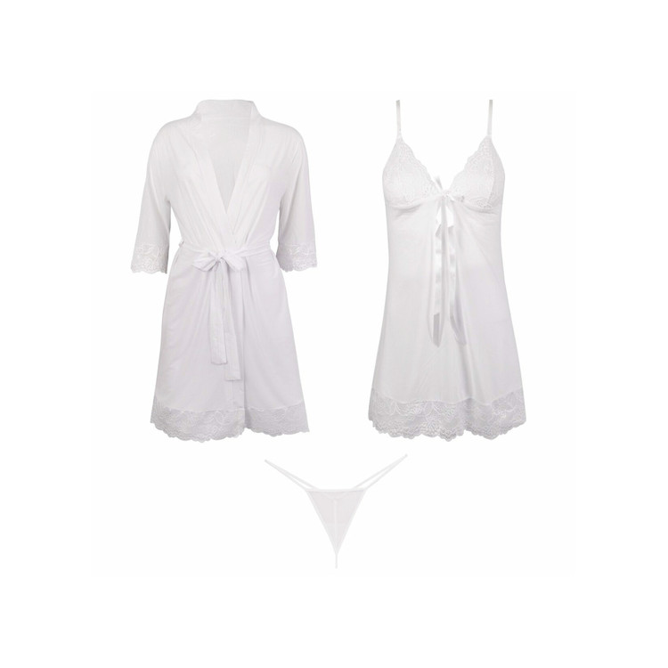 لباسخواب سه تیکه شامل یکعدد شورت بکلس ، یکعدد پیراهن و یکعدد روبدوشامبر میباشد که ترکیبی از حریر و دانتل است